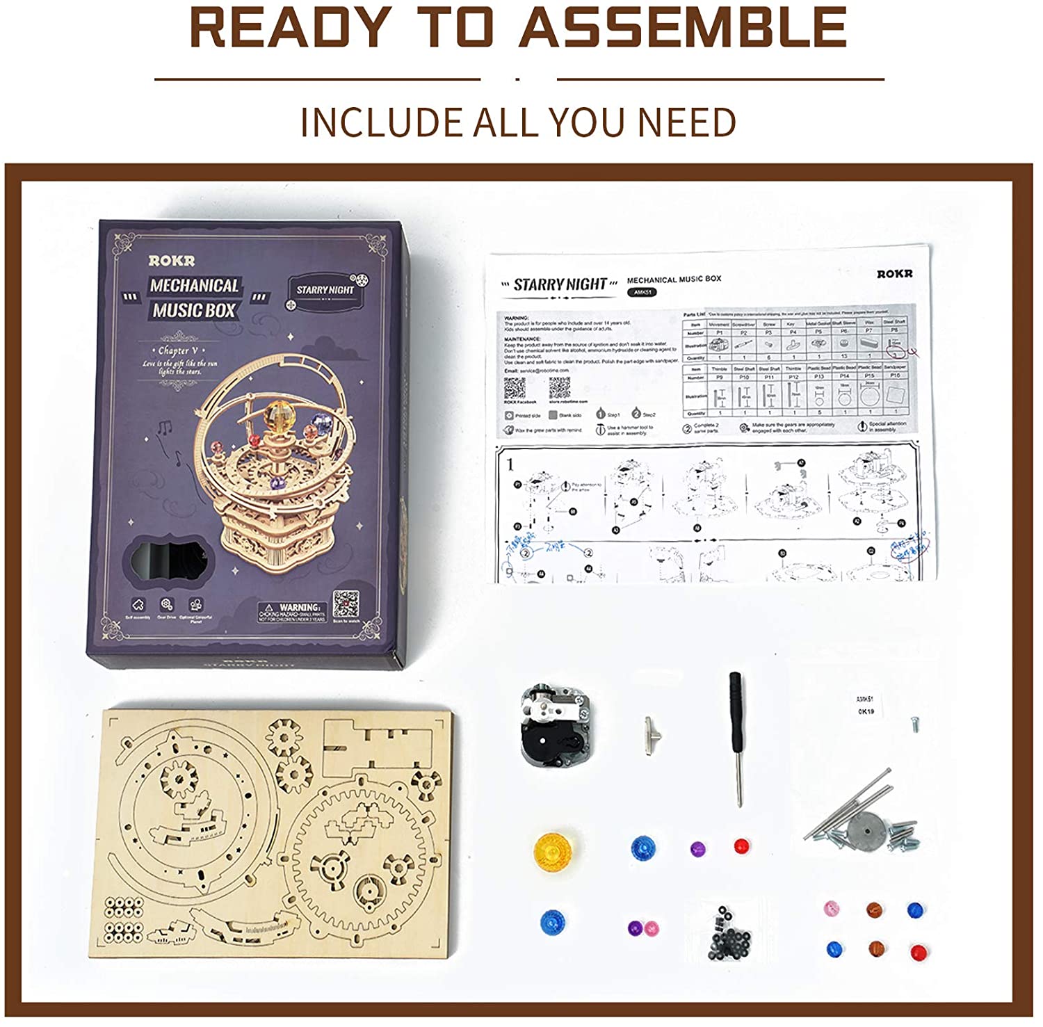 Construct your own solar system and music box! Demonstrating the relative positions and general motions of planets, this 3D puzzle DIY wooden model makes a fantastic educational material and home décor. It is also a music box that plays a beautiful tune when revolving.