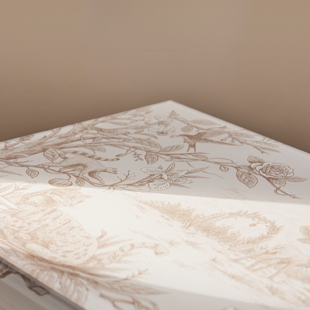 Elegant Glass Lid: Features a clear surface with decorative, nature-inspired artwork underneath