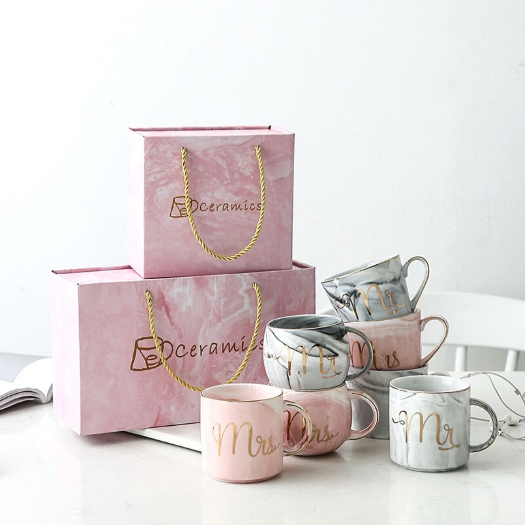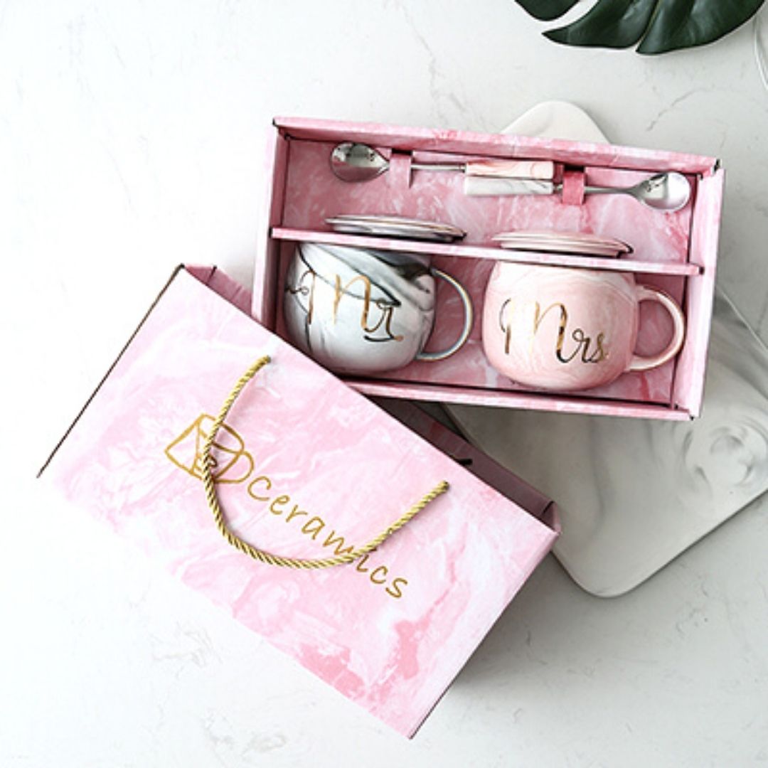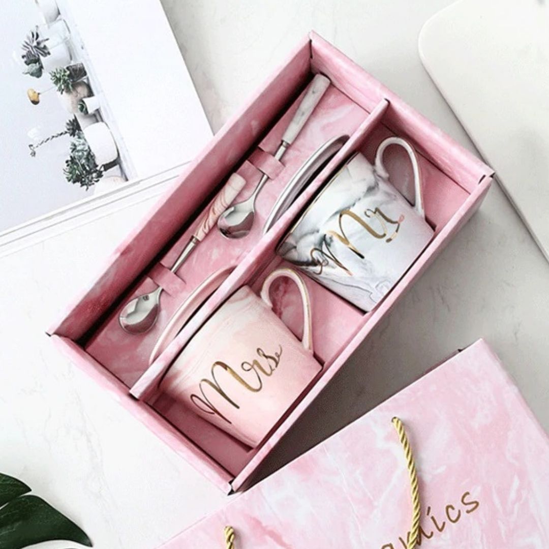 The Mr. & Mrs. Mugs set is an adorable present for couples. They come with lids to keep the coffee hot, as well as two golden spoons for stirring! The mugs are handmade so each has its own unique elegant marble design. The mugs are made of ceramic, whose patterns will never fall off. On both the inside and outside of cups, marble glaze is used as a way to create a unique feature.