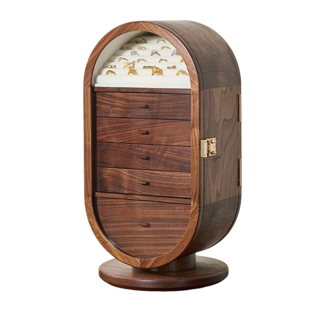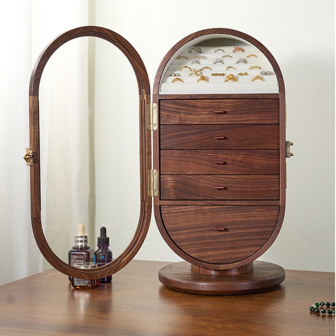 Elegant Design: Luxurious solid walnut wood jewelry box featuring 5 drawers, a mirror, and convenient necklace hooks.