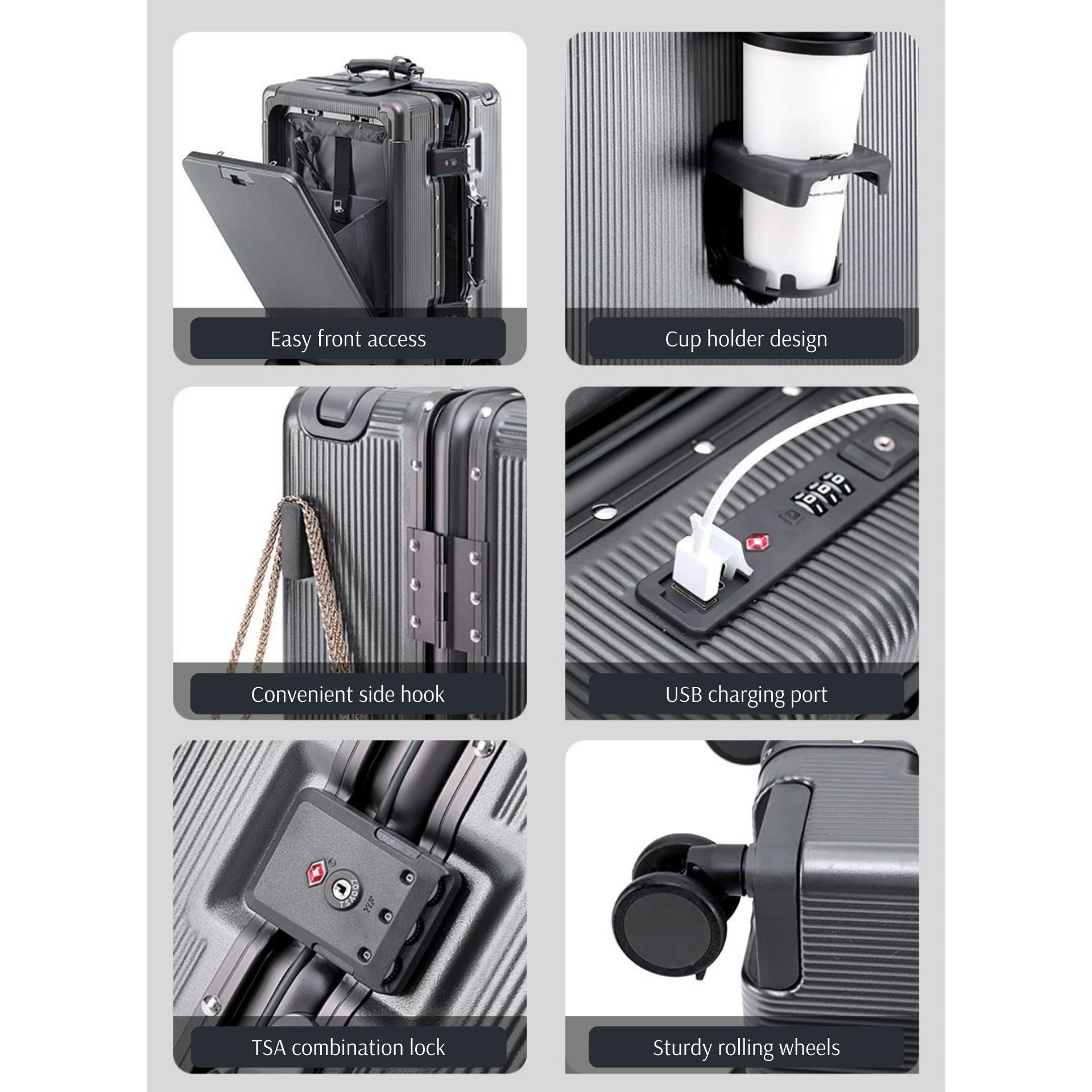 • Smart Travel Tech: Smart traveler-friendly features including built-in USB charging port, external cup holder, and integrated TSA-approved lock