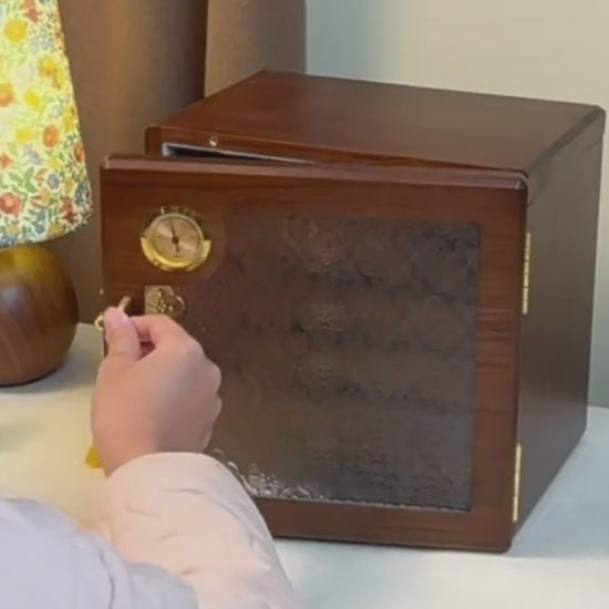 • Built-In Hygrometer – Equipped with a humidity monitor, helping protect delicate items and preserving the beauty of your collection.